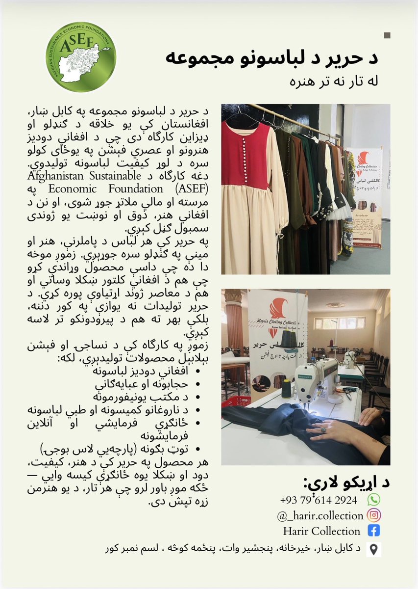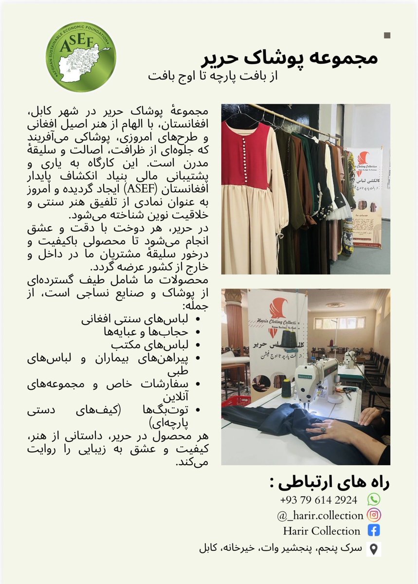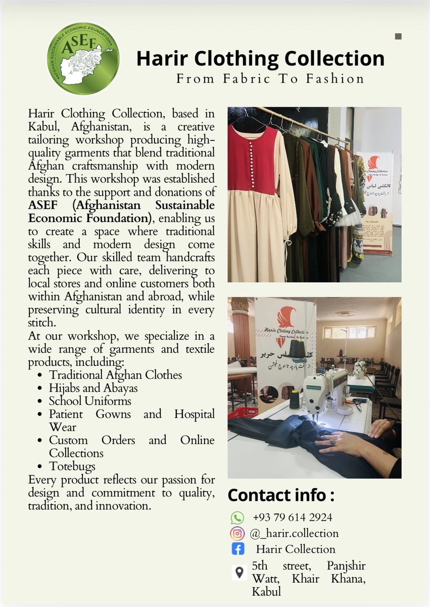 Share Harir Clothing Collection! To our friends and family in the diaspora, please support Afghan women’s entrepreneurship in Kabul, supported by ASEF. Phone: +93 79 614 2924